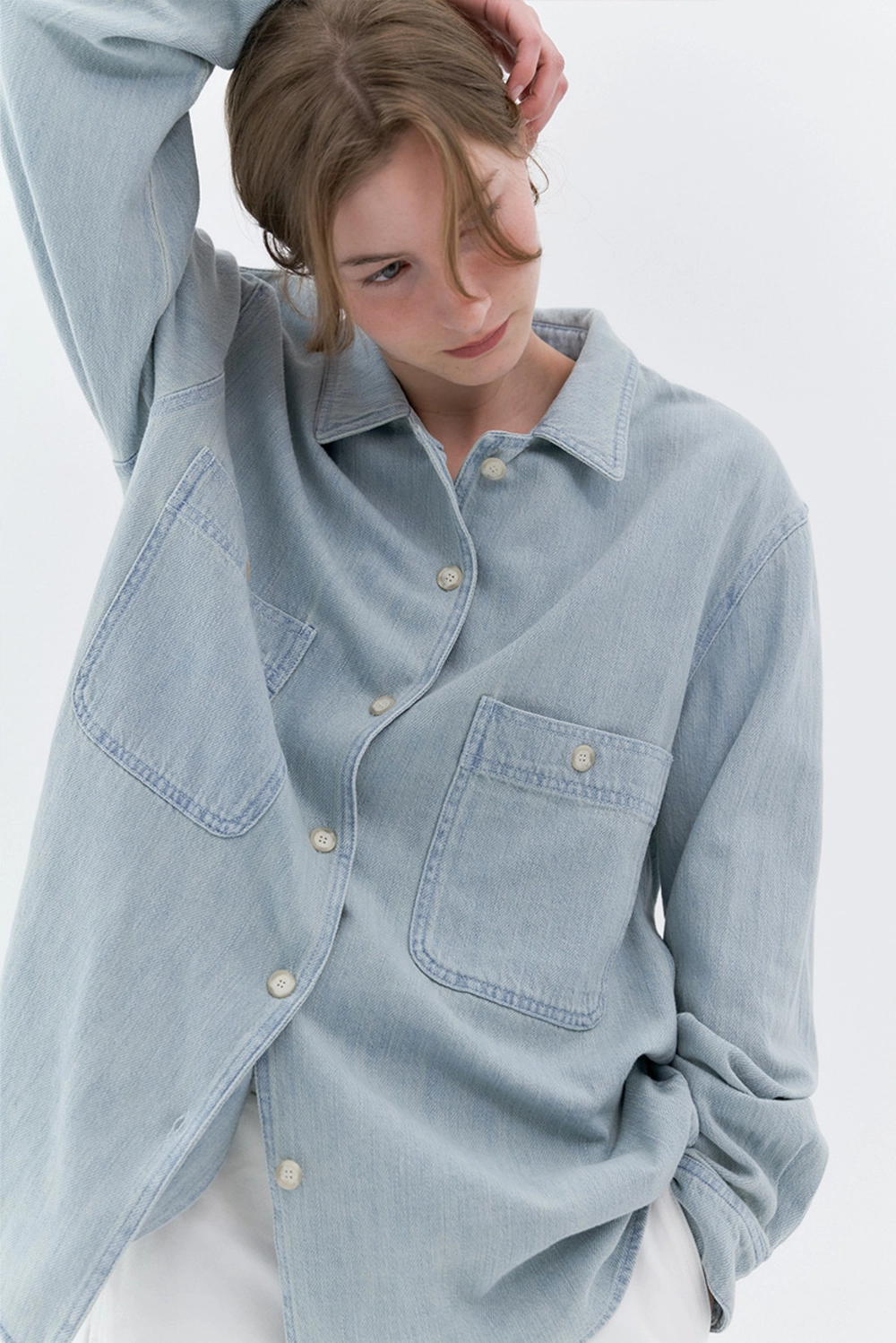 적당한 기장감과 여유 있는 핏으로 착용시,H- 라인 실루엣으로 다양한 제품과 함께 착용이 가능합니다. 전면 포켓으로 워크 셔츠의 디테일을 적용하였고, 실용성을 확보 하였습니다. 부드러운 터치감의 데님원단을 사용하여 아우터 혹은 셔츠 형태로 착용할 수 있는 활용도 높은 아이템 입니다. FW시즌에 어울리는 빈티지한 컬러감의 워싱 컬러를 자랑합니다