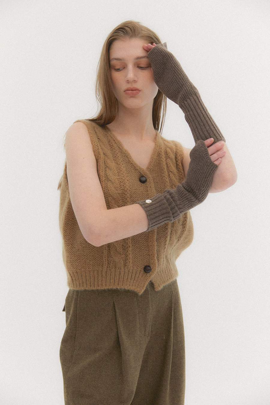 캐시미어와 울 혼방의 롱 워머 제품으로 터치감이 부드럽고 스판사로 적당한 텐션감으로 손등부터 손목까지 감싸주어 안정적인 착용감을 선사하며 라운드 곡선 쉐입의 디자인이 보온성과 활동성 모두 완성 시켰습니다. 포인트 아이템으로 다양한 이너와 레이어드 연출 하기 좋습니다.