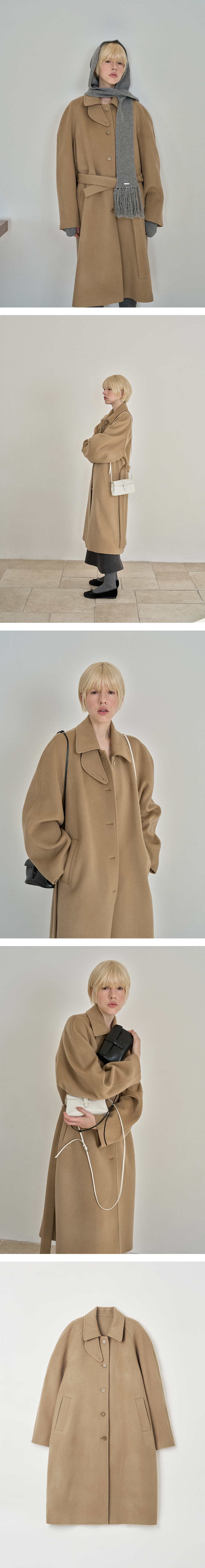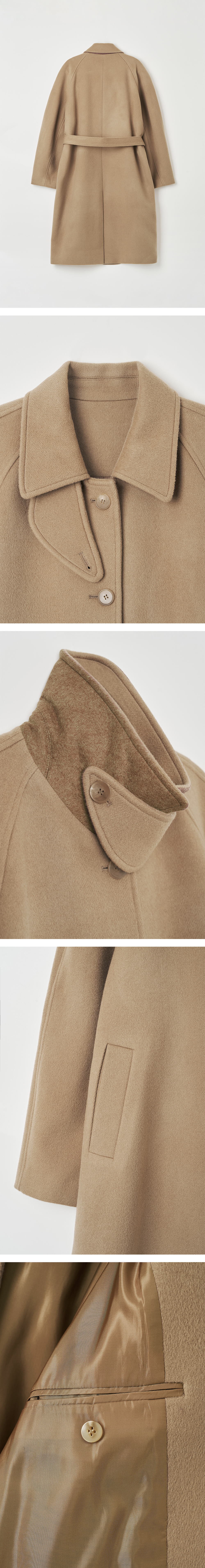입체감 있는 라운드 형태의 숄더가 매력적인 발마칸 코트 입니다. LAMBS WOOL과 CASHMERE 혼용소재로 부드러운 텍스쳐감과 클래식한 감성이 느껴지며 여유롭게 떨어지는 핏과 무릎을 충분히 덮는 길이가 멋스러운 롱코트로 만들었습니다. 카라는 목을 따듯하게 감싸주는 넥 패널 구조로 올려서 착용하였을때 배색원단을 사용하여 포인트 될 수있도록 디자인 하였습니다. 같은 원단의 벨트로 취향에 따라 가볍게 매듭지어 안정적이면서도 멋스러운 룩을 연출합니다.