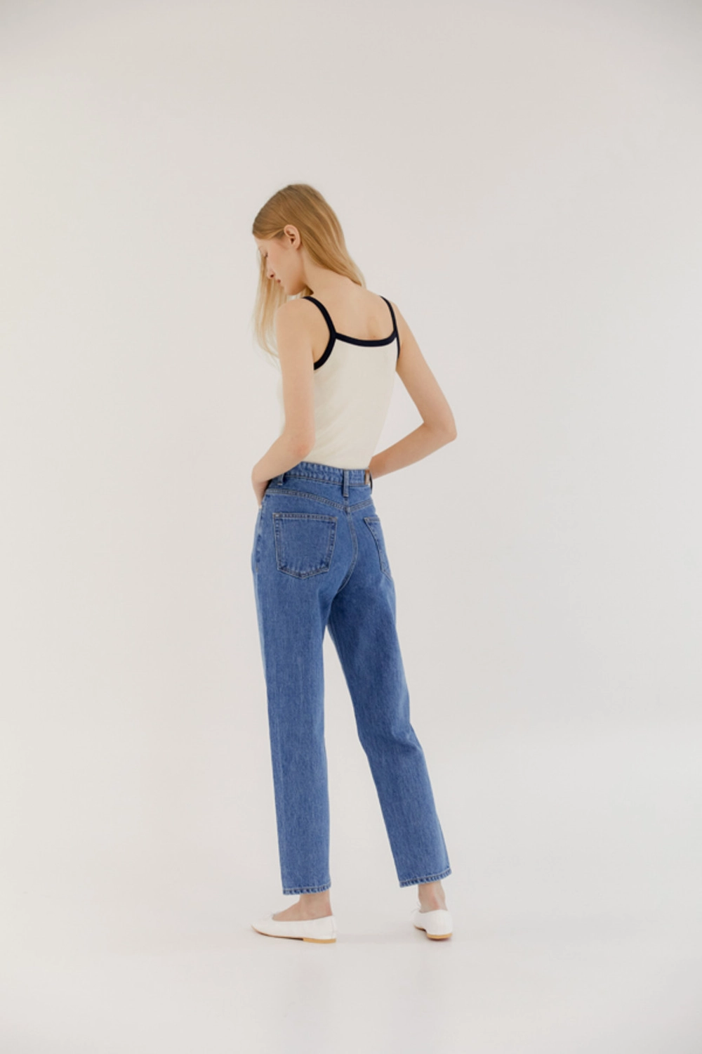 130년의 역사를 자랑하는 데님 패브릭 전문 미국 CONE MILL 사에서 만드는 친환경 재배방법으로 만들어진 프리미엄 오가닉 코튼 소재로 탄탄함과 부드러운 터치감을 자랑합니다. 편안한 착용감의 하이웨스트와 폭이 좁아지는 테이퍼드핏의 크롭 데님으로 프렌치무드의 도러블함을 연출 할 수 있습니다.