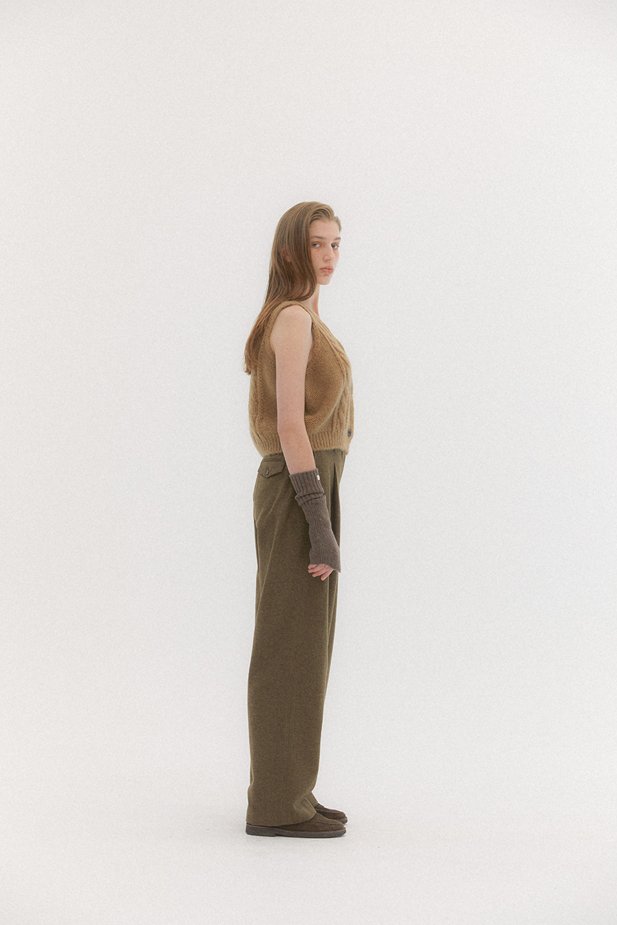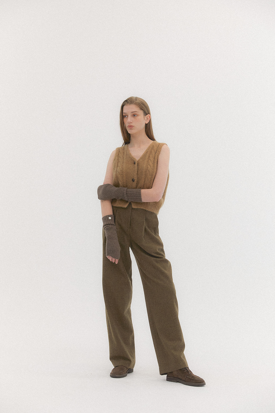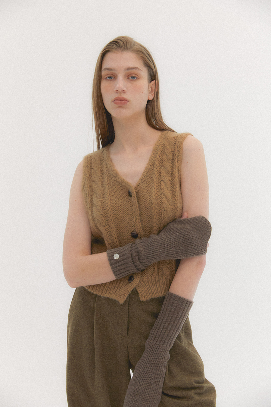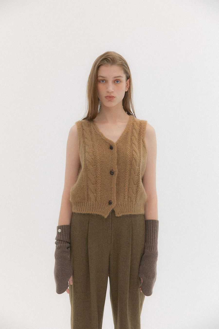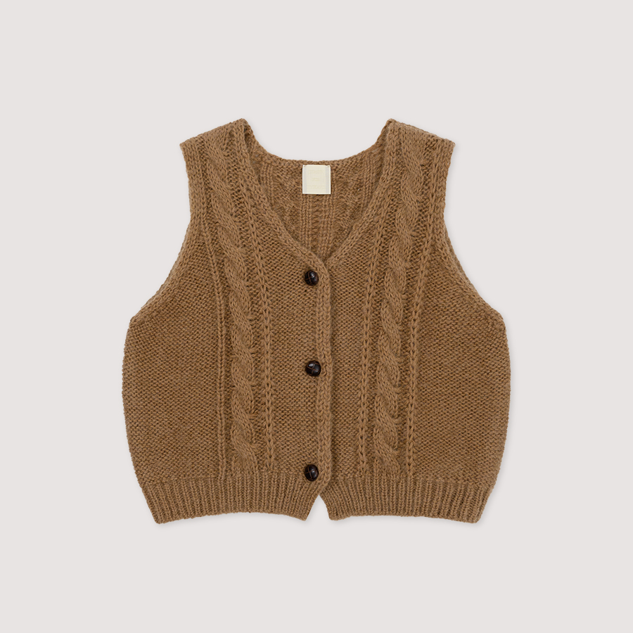 굵고 헤어리한 키드모 혼방 원사를 사용한 니트 베스트로 두께와 부피감은 안정감있게 도톰한 형태이지만