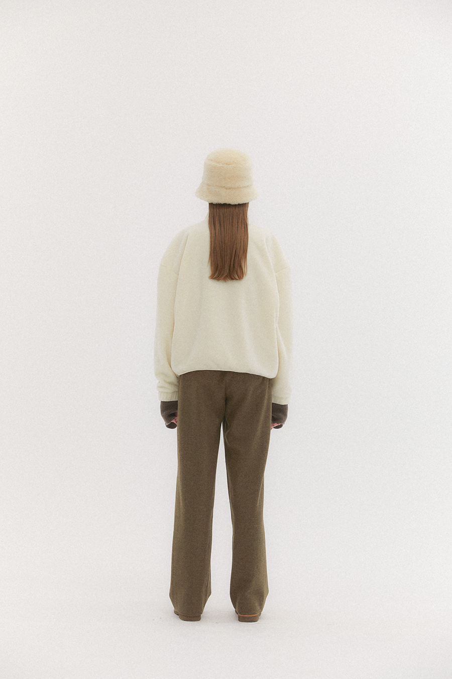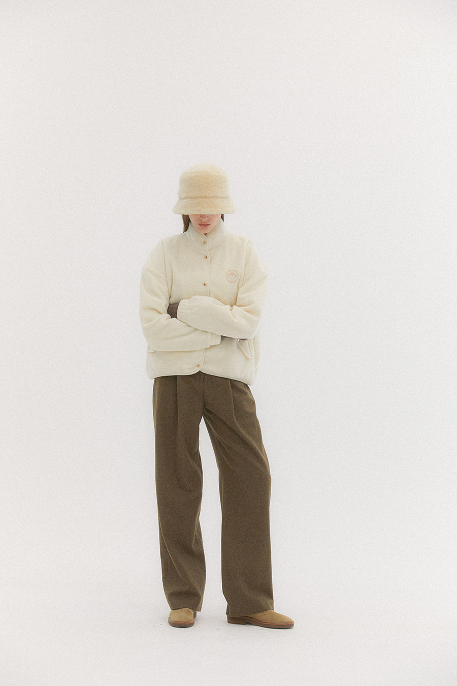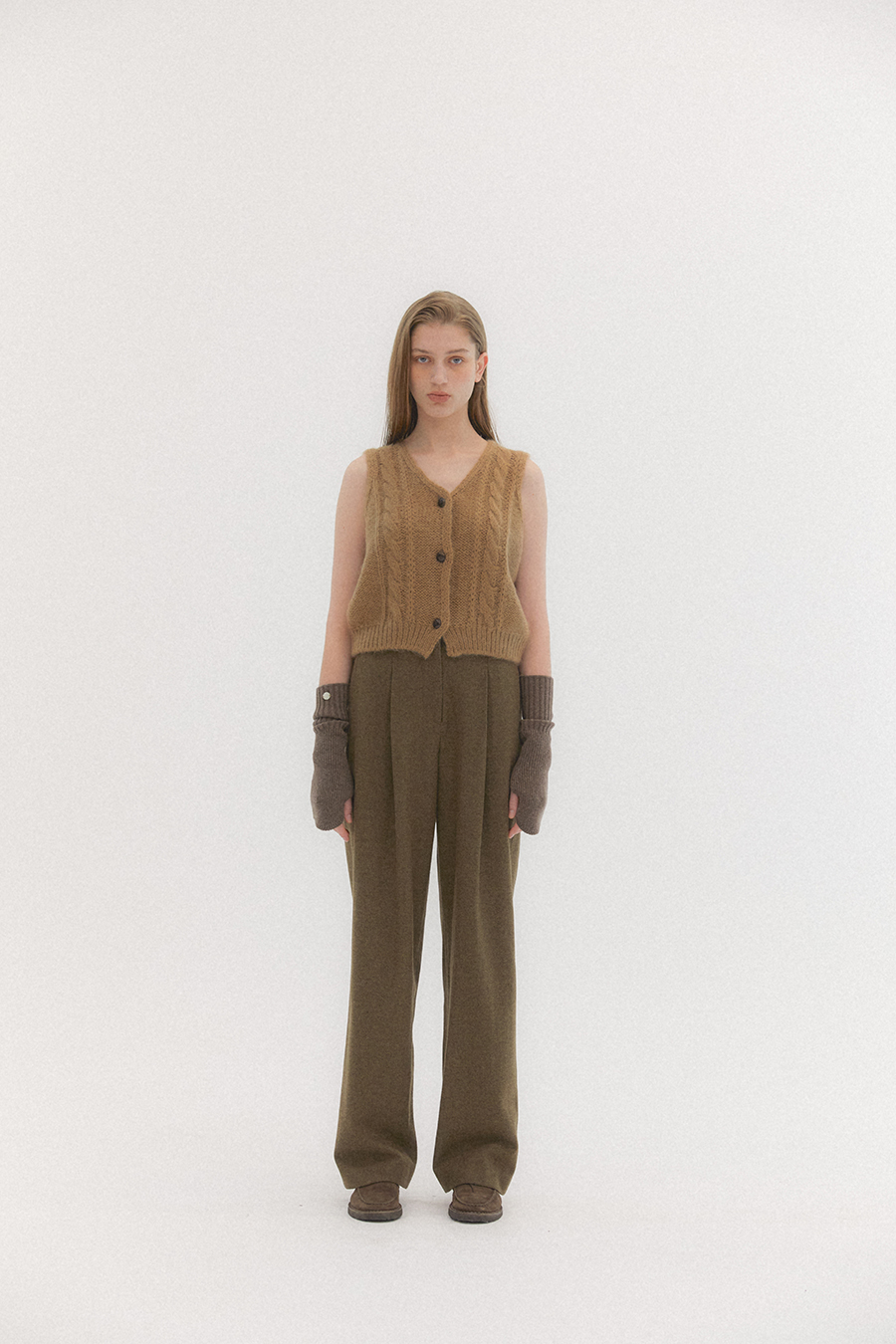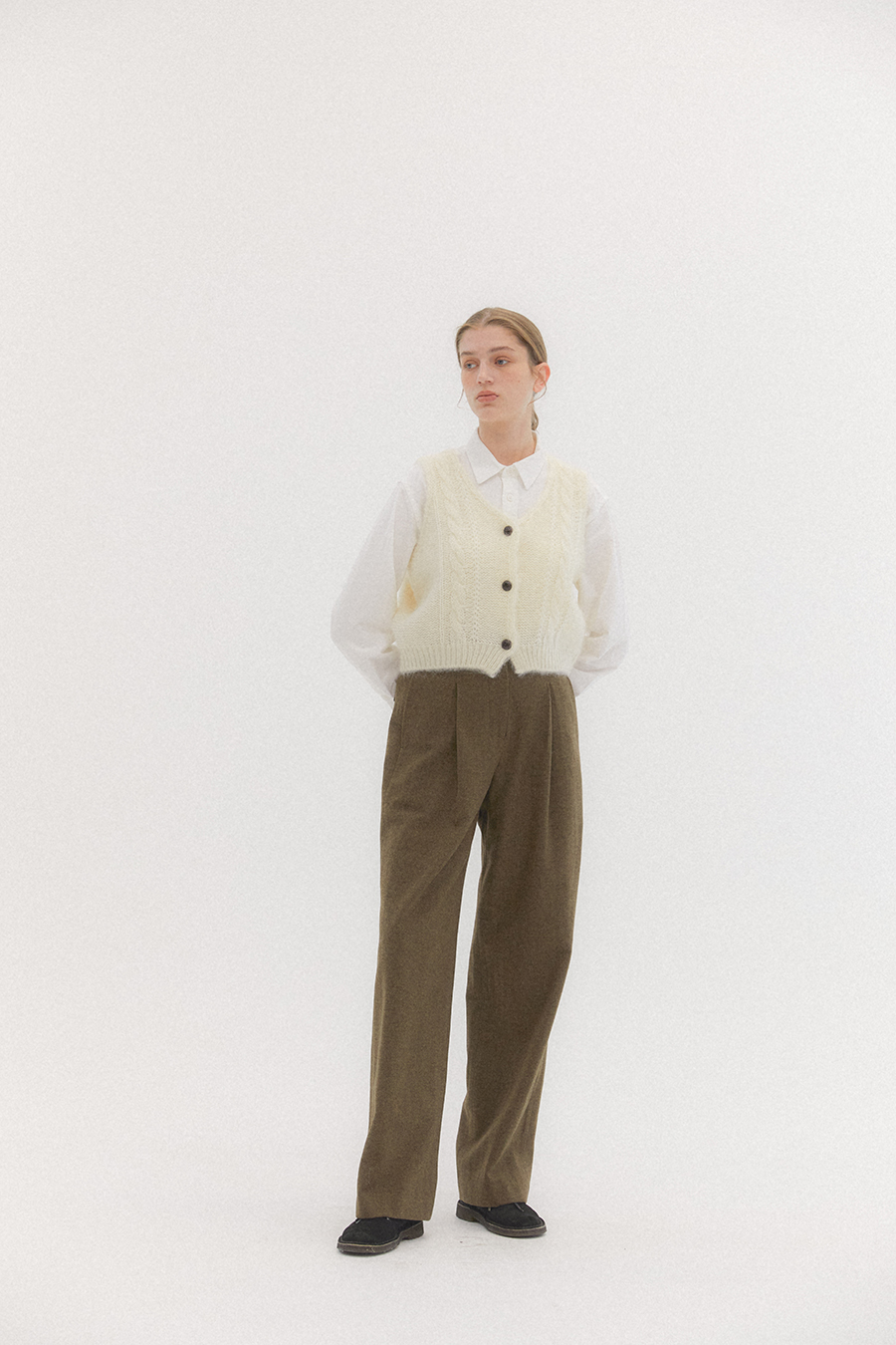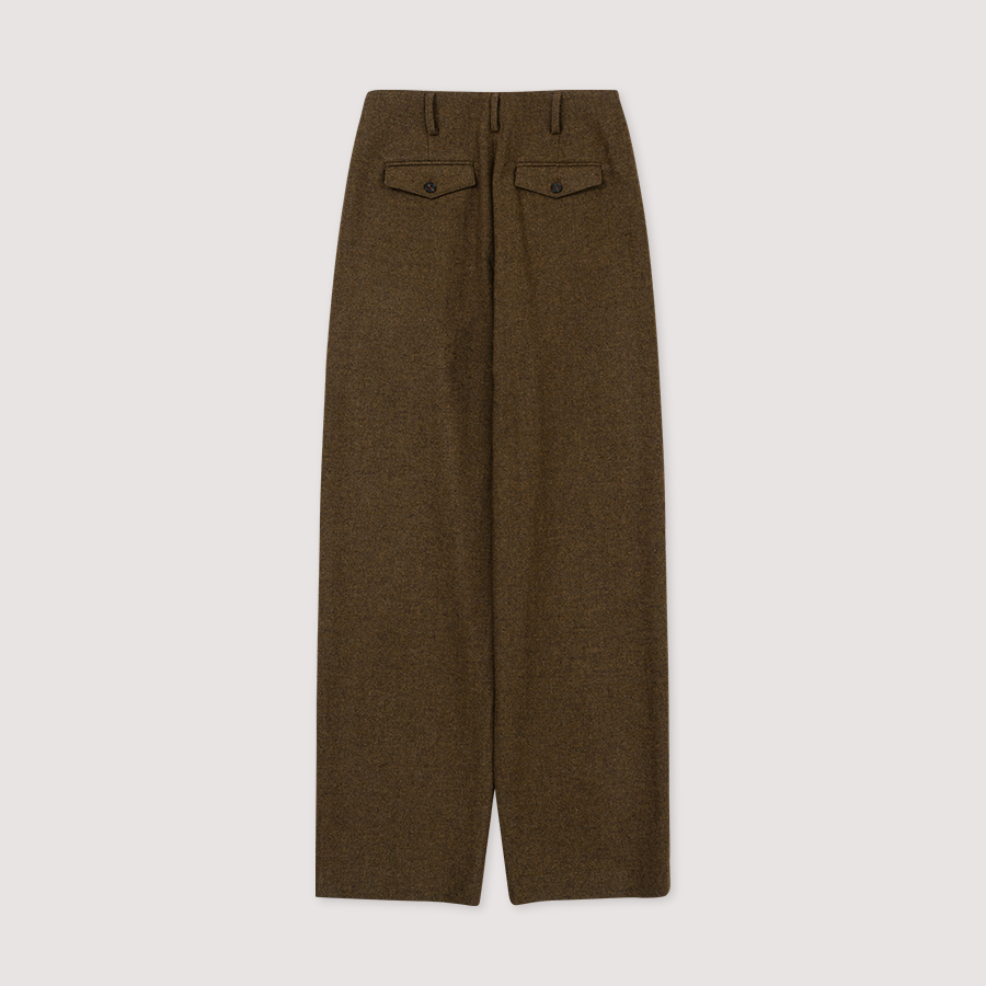 헤링본 조직감의 울 함유량이 높은 원단으로 매치하는 상의에 따라 캐주얼 하거나 포멀한 룩 다양하게 연출 할 수 있습니다. 핀턱 디테일로 볼륨감과 여유로운 실루엣이 특징입니다. 세미 하이웨이스트 라인으로 체형 보완에도 도움을 줍니다. 팬츠 뒷포켓은 아웃포켓에 로고소뿔 단추로 포인트를 주었으며, YKK 양면지퍼 히든 후크의 여밈 형식 입니다.