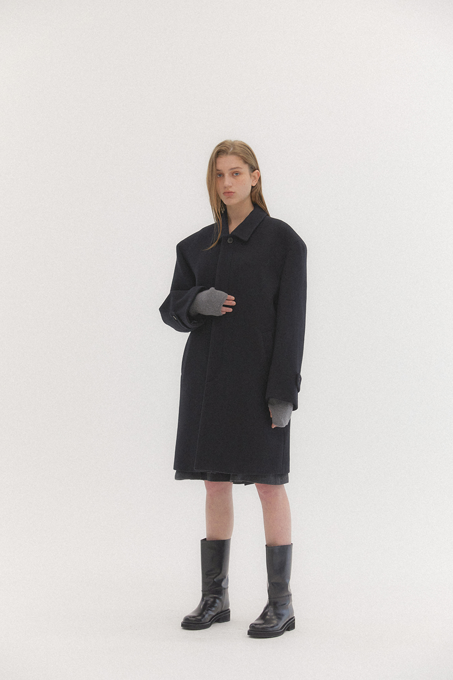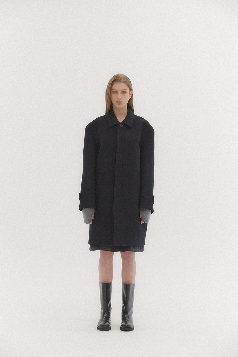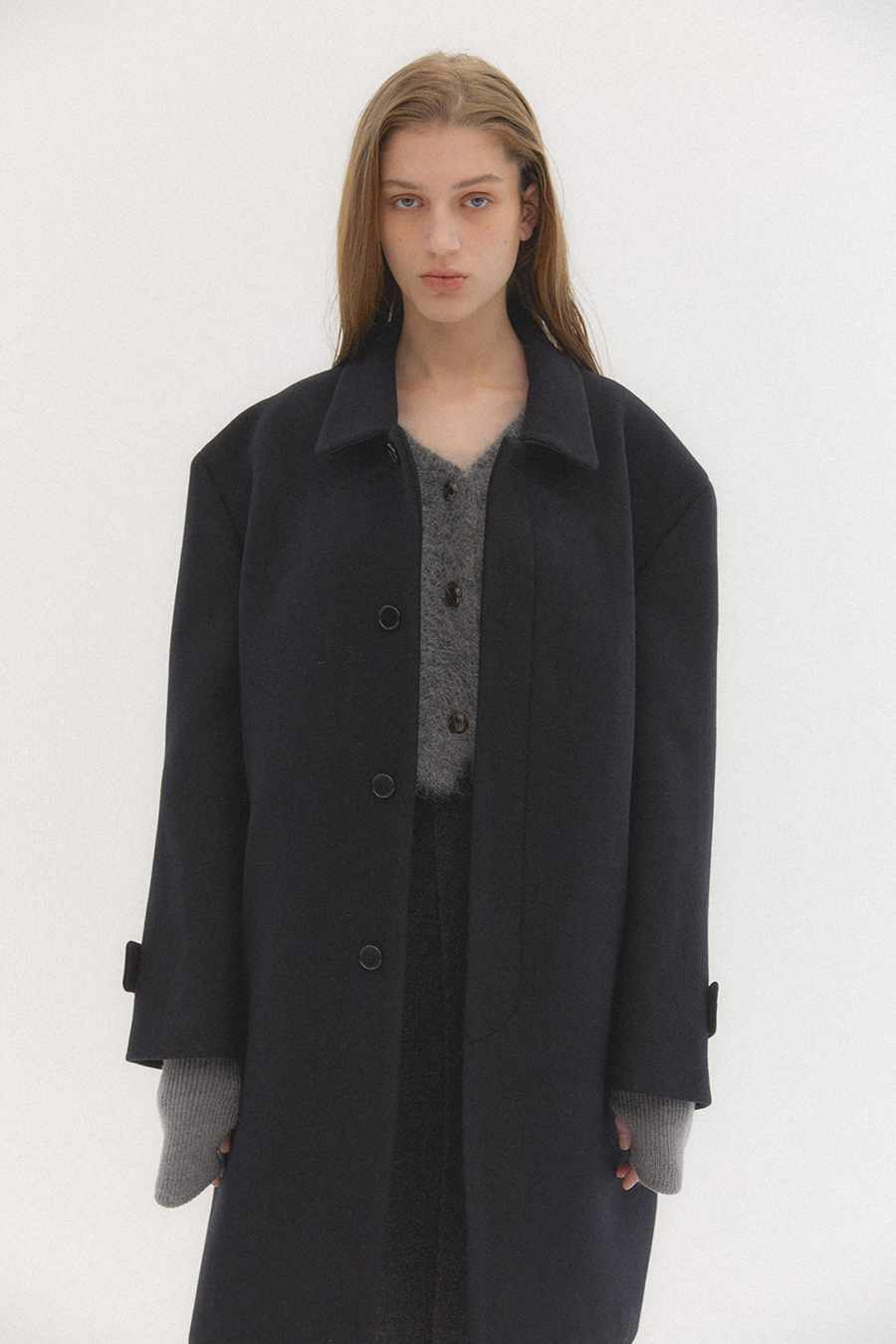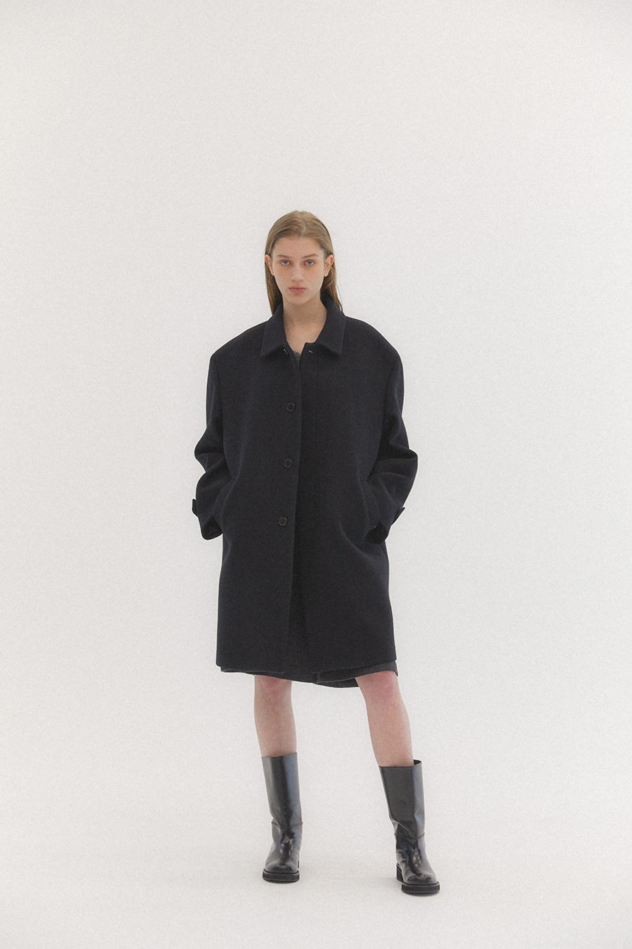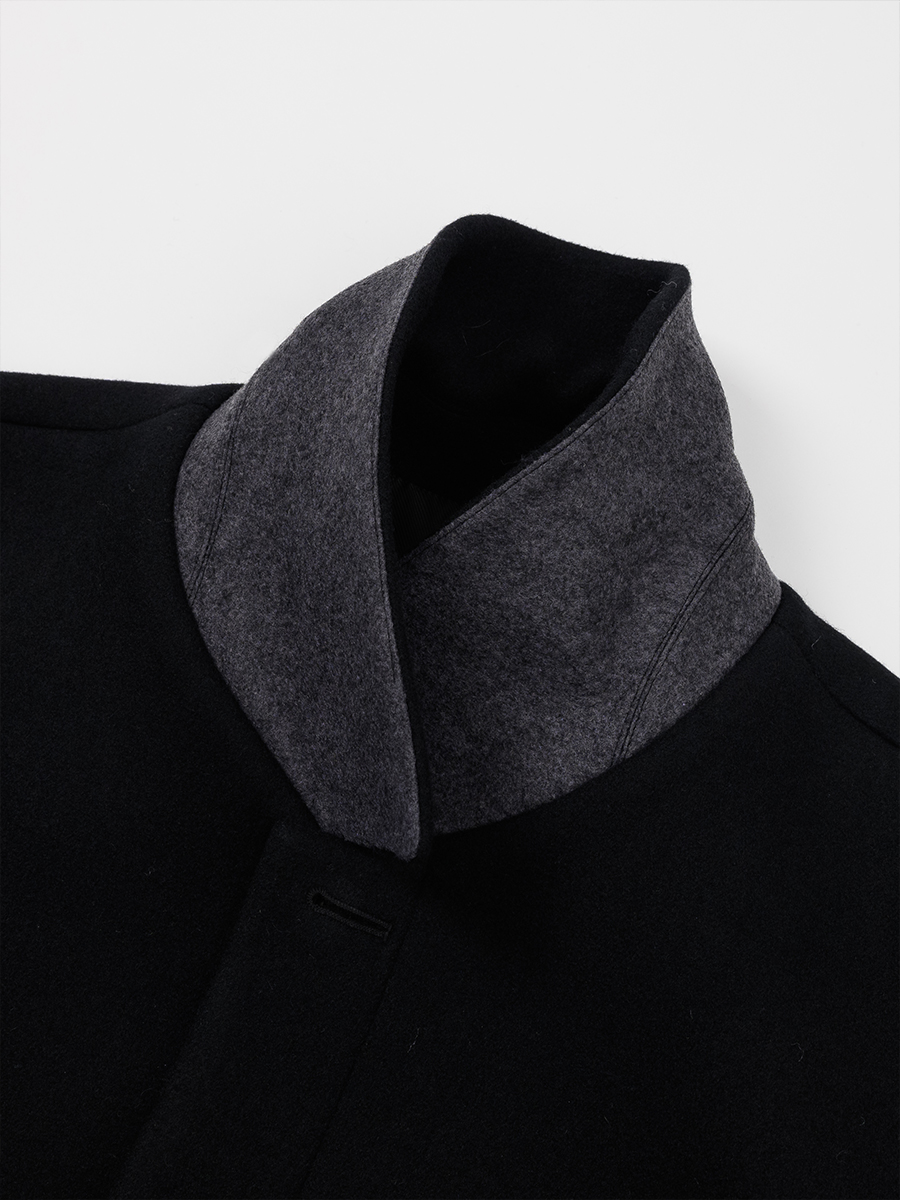 오버사이즈 드롭 숄더와 스트레이트 실루엣의 탄탄하고 무게감이 느껴지는 클래식한 이중직 펠트 소재의 싱글 브레스트 코트 입니다. 플라이 프런트 디테일이 세련되고 말끔한 인상을 줍니다.