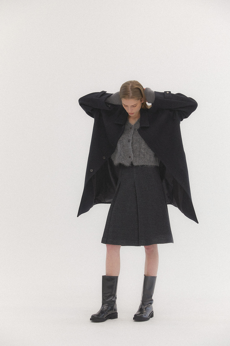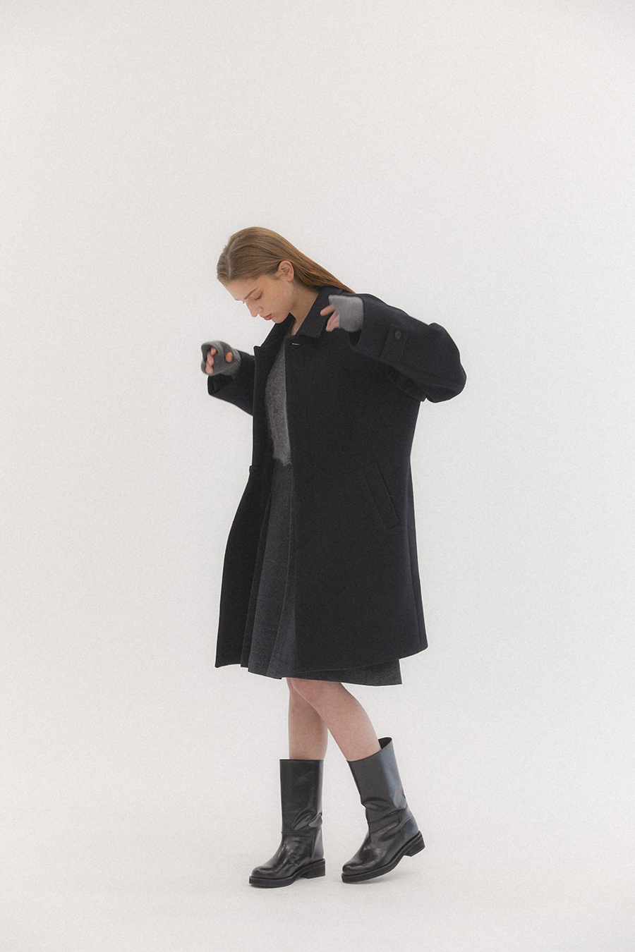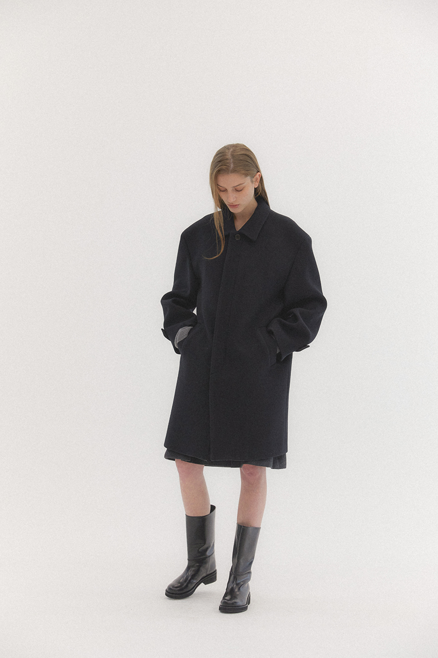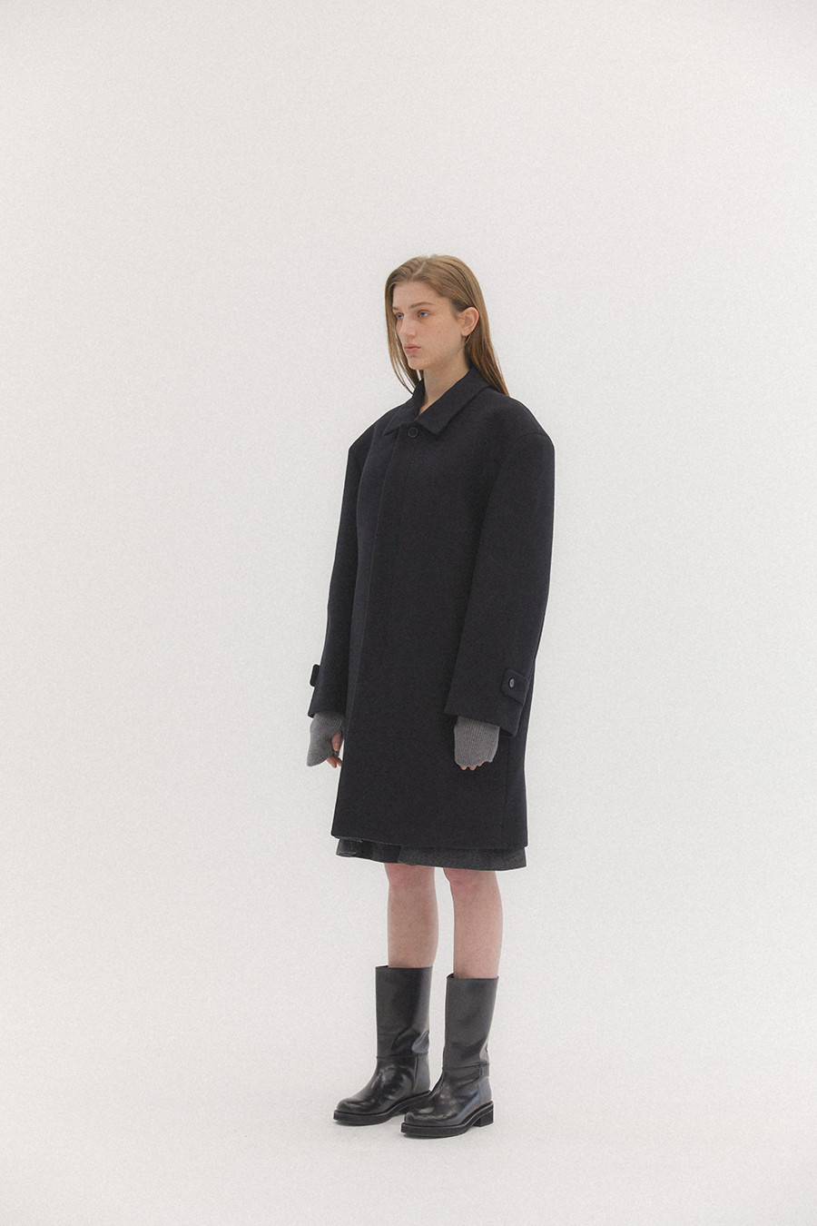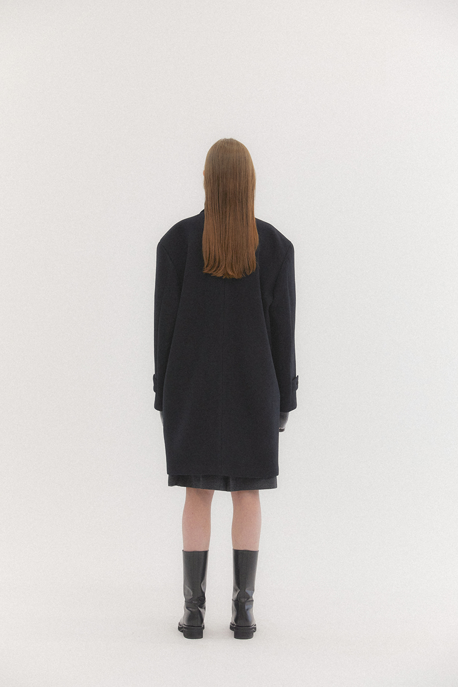 오버사이즈 드롭 숄더와 스트레이트 실루엣의 탄탄하고 무게감이 느껴지는 클래식한 이중직 펠트 소재의 싱글 브레스트 코트 입니다. 플라이 프런트 디테일이 세련되고 말끔한 인상을 줍니다.
