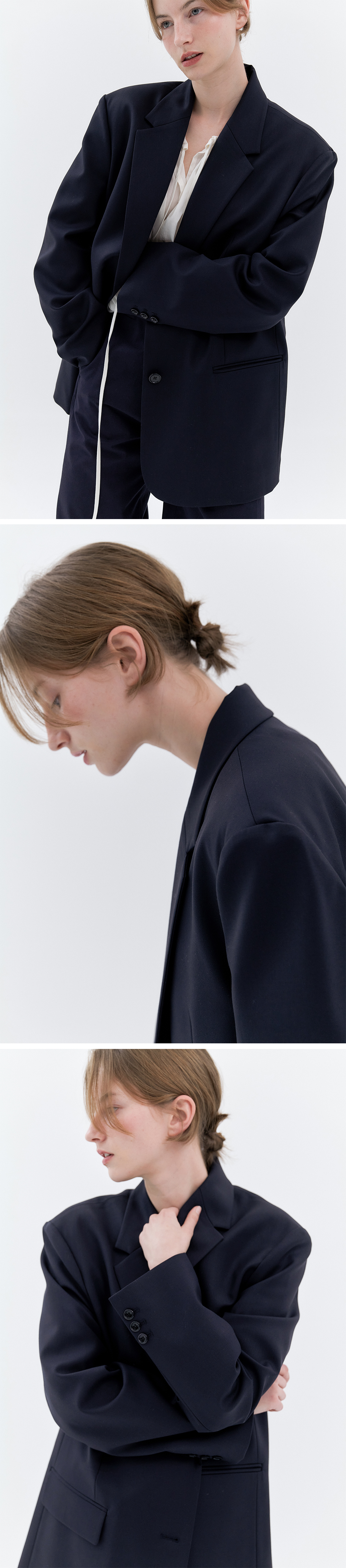 박시한 핏의 어깨라인이며 젠트라 소재의 특성상 울 소재와 혼방되어 우수한 스트래치 성능이 발현되어 탄탄하지만 유연함이 있어 활동성을 높여줍니다.