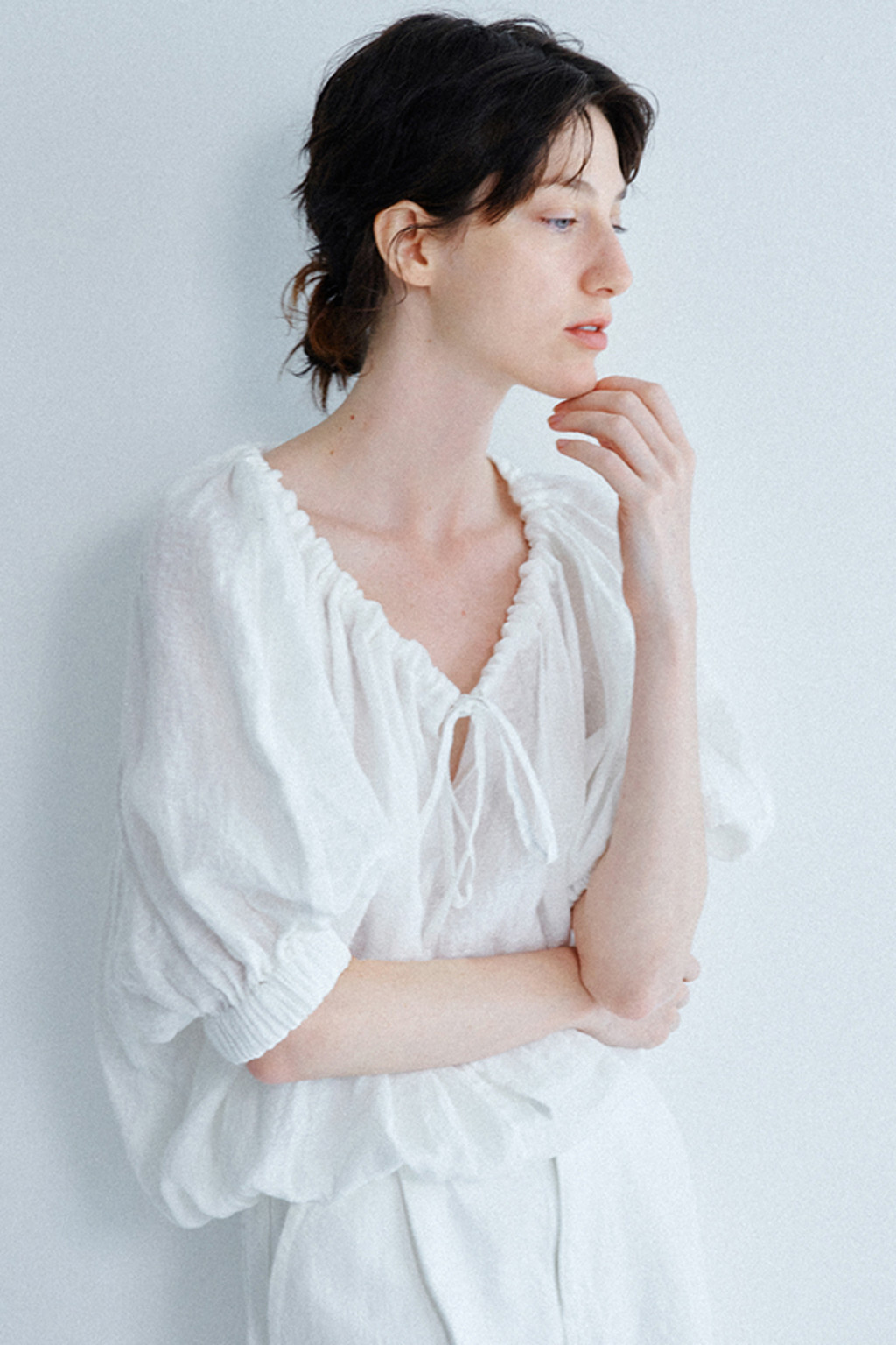 소매와 네크라인을 따라 셔링을 넣어 입체적인 실루엣을 보여주며