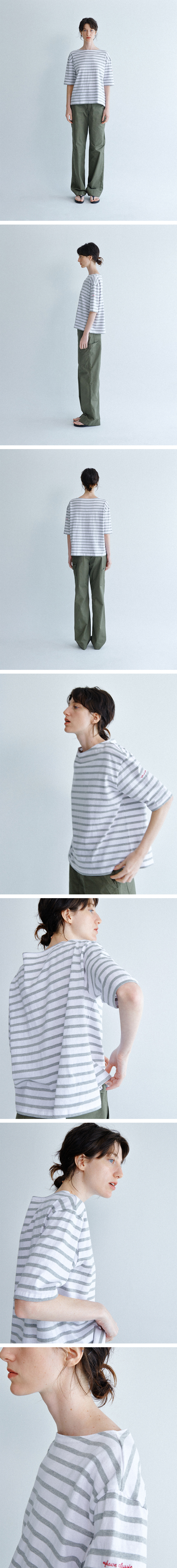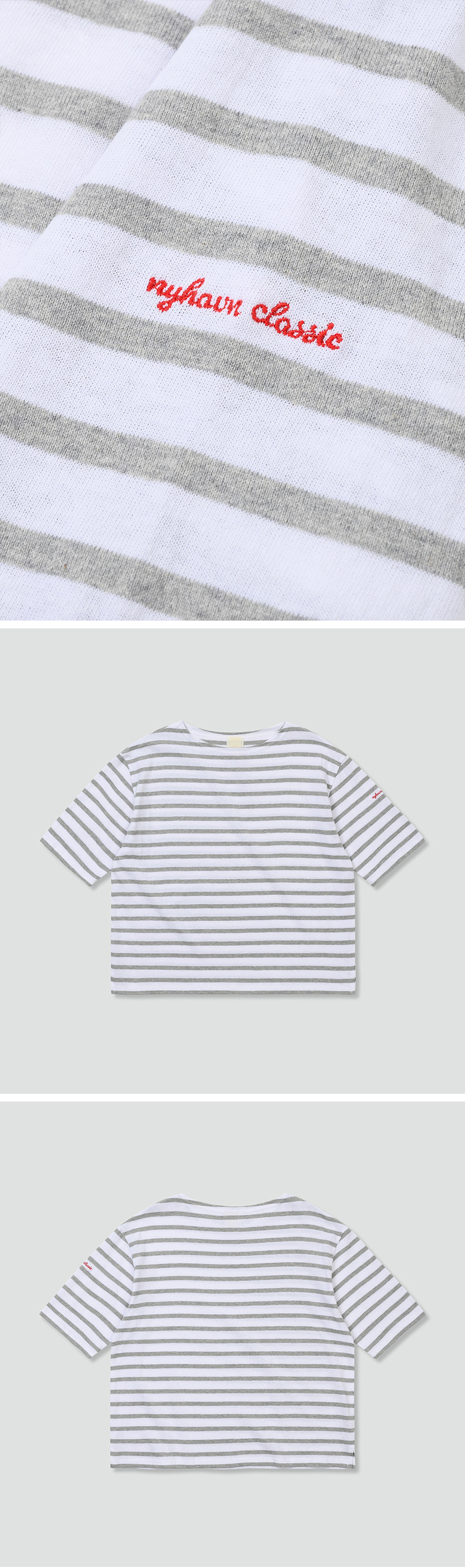 보트넥으로 여성스러움을 살렸으며 , 7부소매의 기장으로 롤업 스타일링이 가능합니다. 선명한 스트라이프라인 사이에 클래식한 필기체 니하운 자수 포인트로 완성도를 높였습니다.