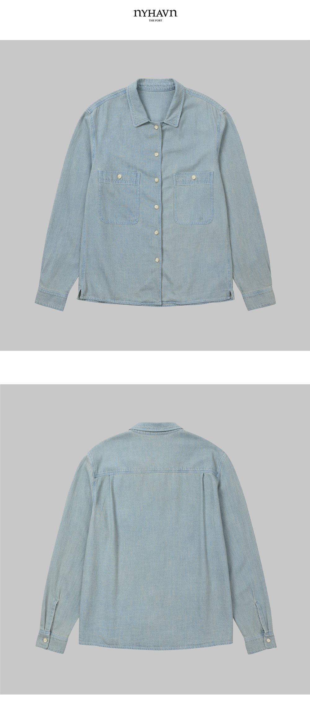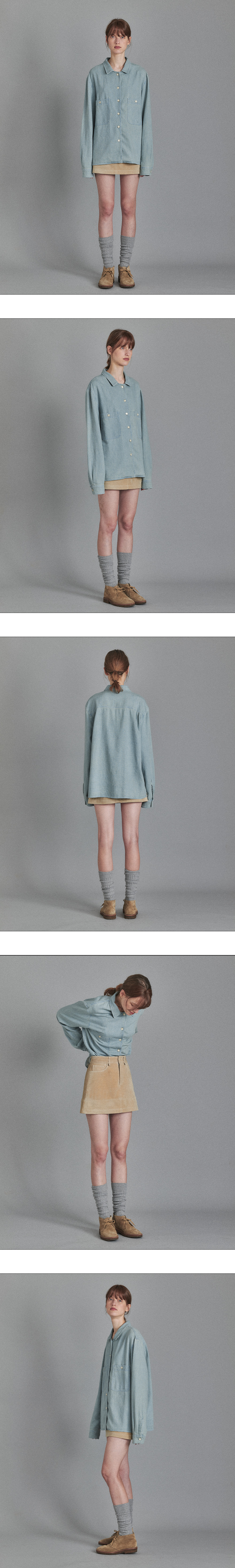 적당한 기장감과 여유 있는 핏으로 착용시,H- 라인 실루엣으로 다양한 제품과 함께 착용이 가능합니다. 전면 포켓으로 워크 셔츠의 디테일을 적용하였고, 실용성을 확보 하였습니다. 부드러운 터치감의 데님원단을 사용하여 아우터 혹은 셔츠 형태로 착용할 수 있는 활용도 높은 아이템 입니다. FW시즌에 어울리는 빈티지한 컬러감의 워싱 컬러를 자랑합니다
