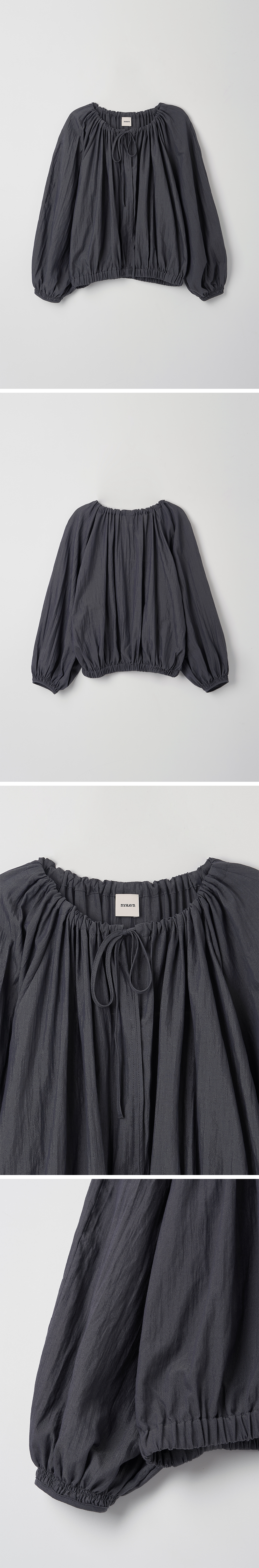 래글런 소매와 네크라인을 따라 셔링을 넣어 입체적인 실루엣을 보여주는 블라우스입니다.