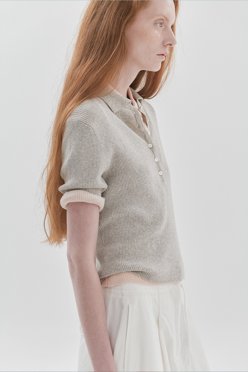 14 Gauge 골지조직으로 제작 되었습니다. COTTON 100% 혼용률로 통기성이 좋으며 한여름 쾌적하게 착용할 수 있습니다. 골지조직으로 바디 쉐입에 따라 편안한 핏을 선사하며 끝단이 일자로 깔끔하게 떨어지며 안정적인 길이를 갖고 있습니다. 자그마한 칼라와 배색의 아이보리 자개 버튼이 깔끔하게 배치되어 있습니다.