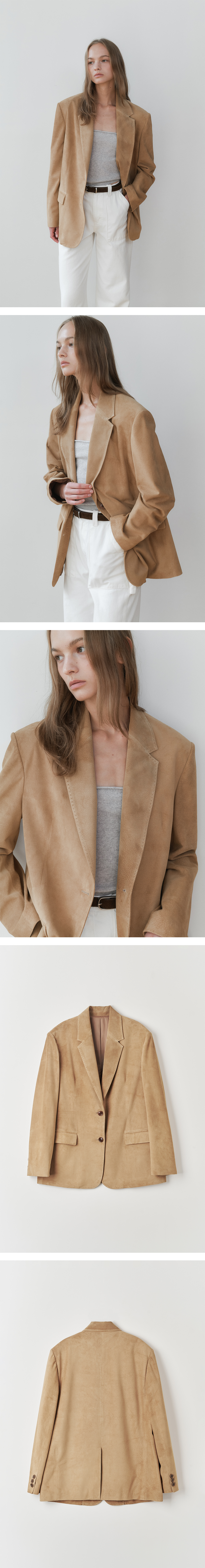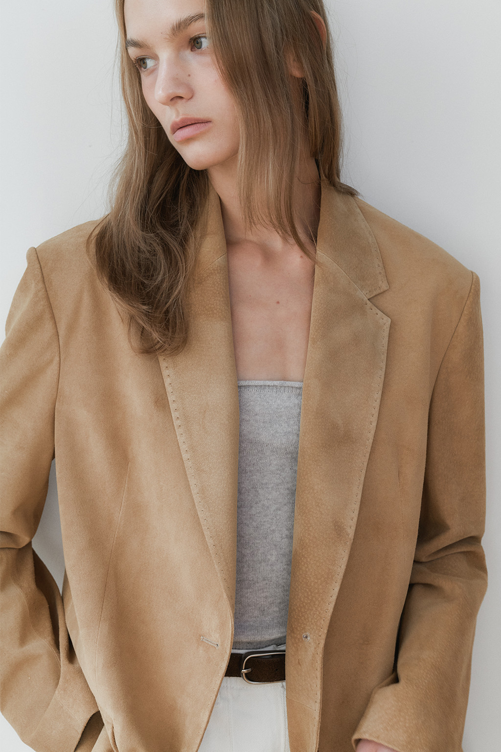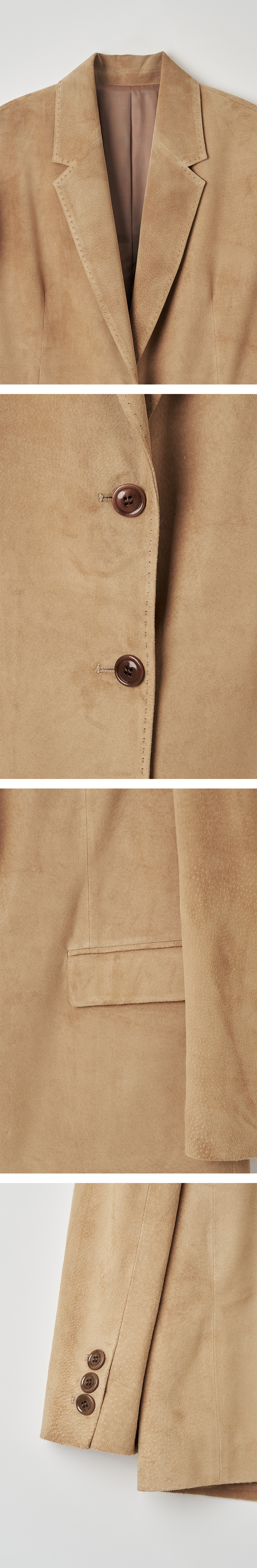 젖은 모래색의 은은한 컬러 스웨이드는 결이 곱고 부드러운 솜털 기모 터치감으로 네츄럴하고 고급스러운 무드가 느껴집니다. 보온성이 좋은 가벼운 소재의 스웨이드는 천연소재로 시간이 지날수록 빈티지한 느낌이 더해져 멋스러워지는 매력이 있습니다. 어깨 패드를 더해 형태감을 잡아주고 군더더기 없이 깔끔한 디자인으로 어느 스타일에도 착용하기 좋은 아이템 입니다. 스웨이드 원단감에 포인트를 더할 수 있는 니하운 로고가 더해진 브라운컬러 단추를 사용해 멋스럽게 조화를 이루고 있습니다.