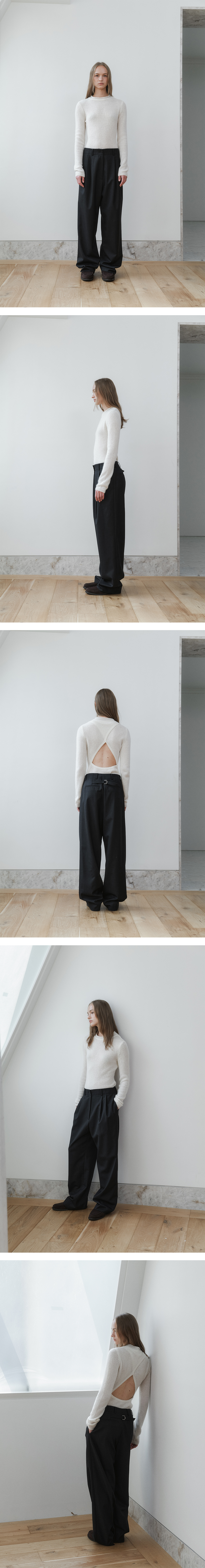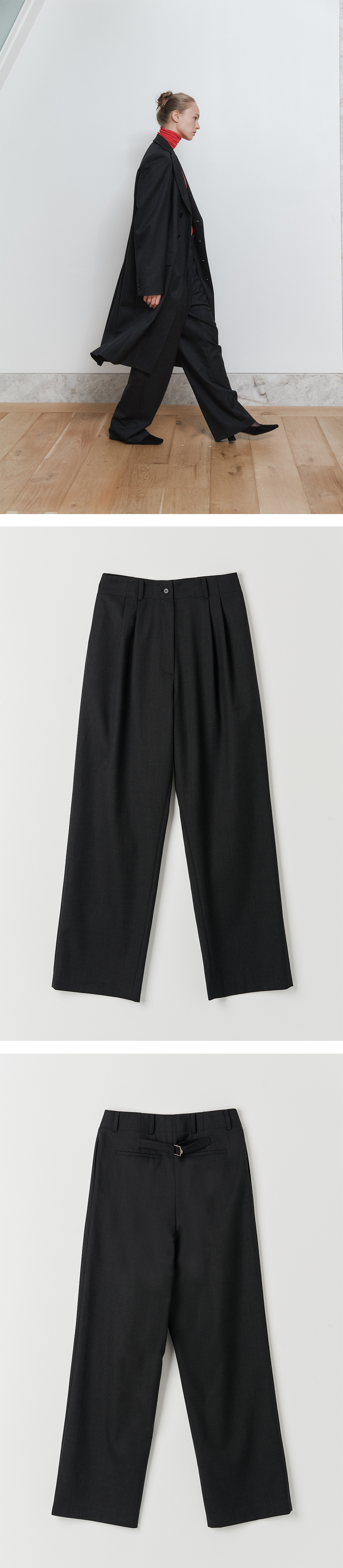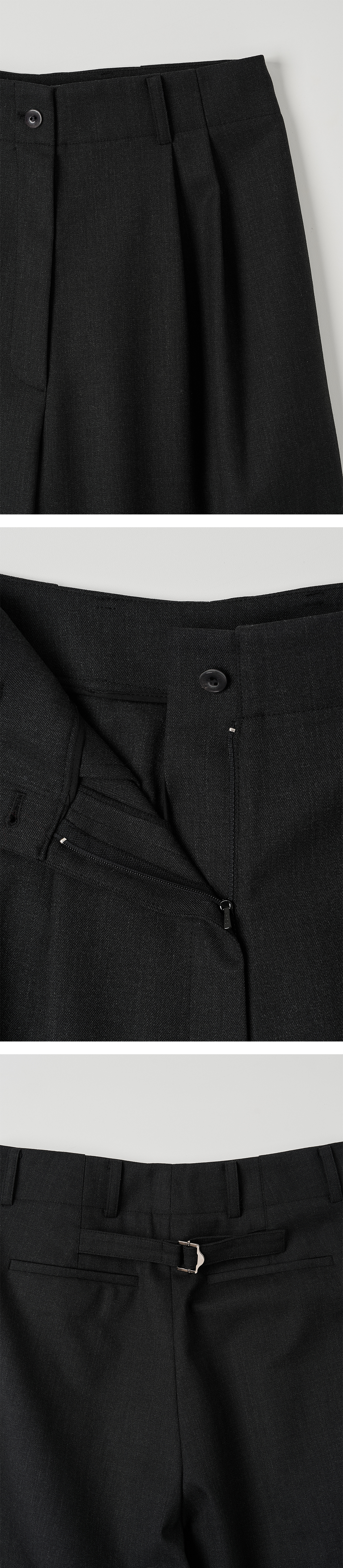 울,젠트라 혼방의 고급스러운 광택감과 탄탄한 조직감의 울원단을 사용 하였습니다. 턱 디테일로 볼륨감 있는 실루엣을 만들어 낸 클래식한 팬츠로 원단의 컬러와 맞춘 로고가 각인된 단추를 사용하였으며, 비침이 적은 소재 특성상 논라이닝 제품입니다.