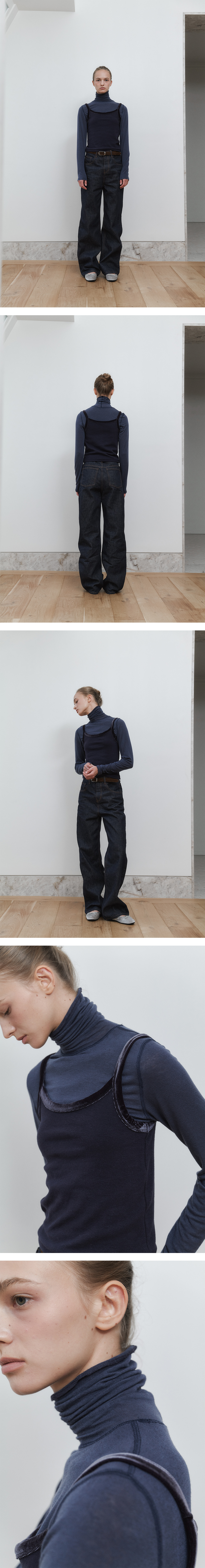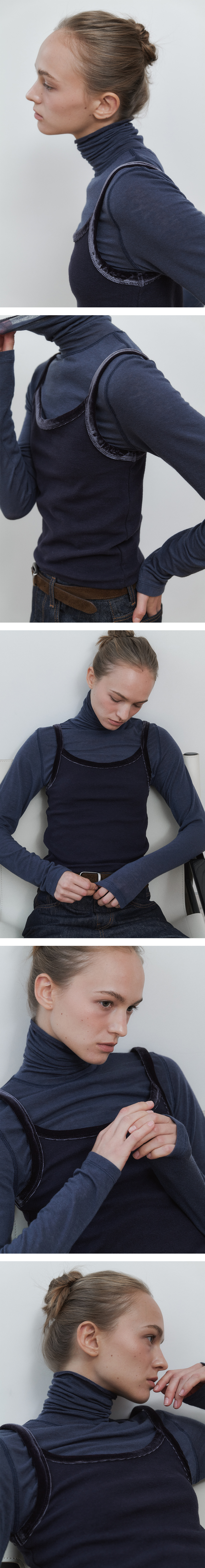 코튼과 스판덱스 혼방 소재로 높은 신축성과 탄력성으로 슬림한 핏 라인을 연출해 주며 깊게 파인 스쿱 넥 라인은 여성스러운 네크라인을 표현하기 적절합니다. 벨벳 리브드 배색 부분은 몸판컬러와 톤온톤으로 매칭되는 컬러 조합으로 포인트 되며 스타일리시한 연출 가능한 아이템입니다.