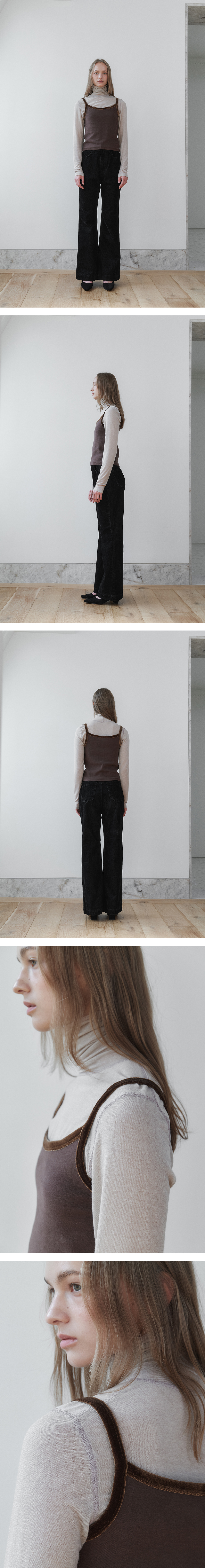코튼과 스판덱스 혼방 소재로 높은 신축성과 탄력성으로 슬림한 핏 라인을 연출해 주며 깊게 파인 스쿱 넥 라인은 여성스러운 네크라인을 표현하기 적절합니다. 벨벳 리브드 배색 부분은 몸판컬러와 톤온톤으로 매칭되는 컬러 조합으로 포인트 되며 스타일리시한 연출 가능한 아이템입니다.