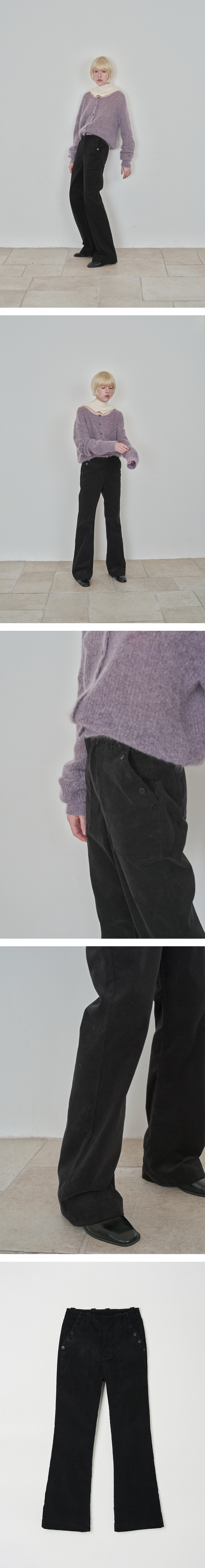겨울 시즌에 잘 어울리는 차분하고 선명한 컬러감이 돋보이는 코듀로이 팬츠 입니다. 코듀로이 원단 사용으로 은은하고 고급스러운 광택감을 보여주며 부드러운 터치감이 특징입니다. 너무 부해보이지 않으려 적당한 골수의 코듀로이 원단을 사용하였으며 니하운만의 시그니쳐 Boots -Cut 핏으로 슬림해보일 수 있게 제작하였습니다. 양 사이드 포켓에 니하운로고 너트 버튼을 더하여 전체적인 실루엣에 방해되지 않으면서도 빈티지한 포인트롤 주었습니다.