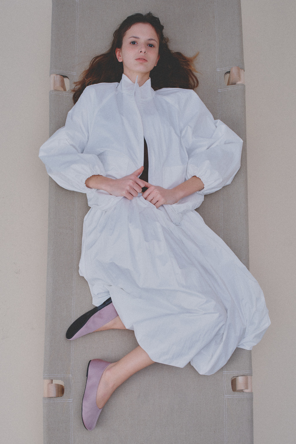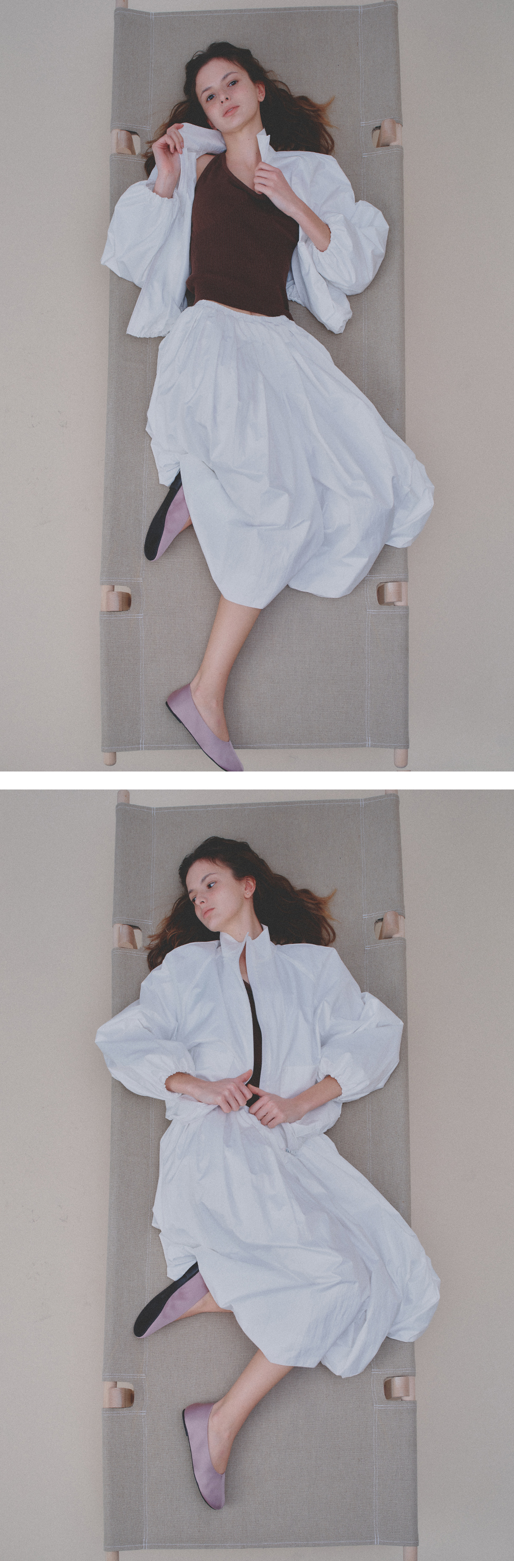 스트링이 내장된 헴 라인으로 다양한 스타일로 연출할 수 있으며 래글런 소매로 내추럴하게 떨어지는 소매와 밑단 셔링에서의 볼륨감이 돋보입니다.