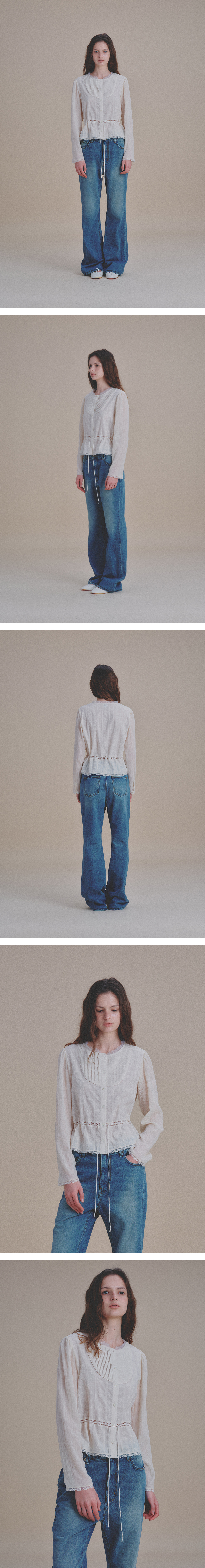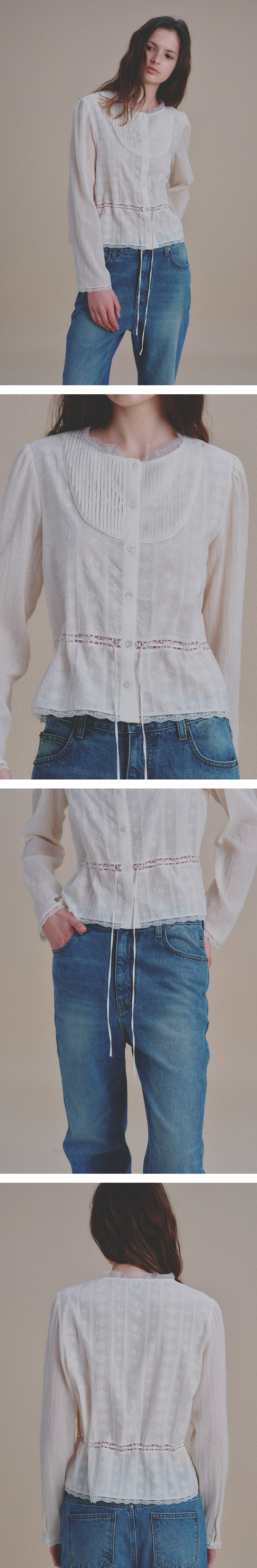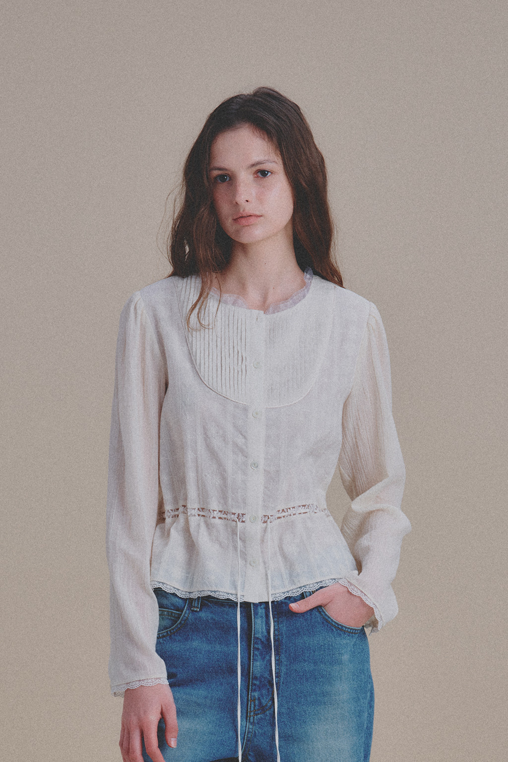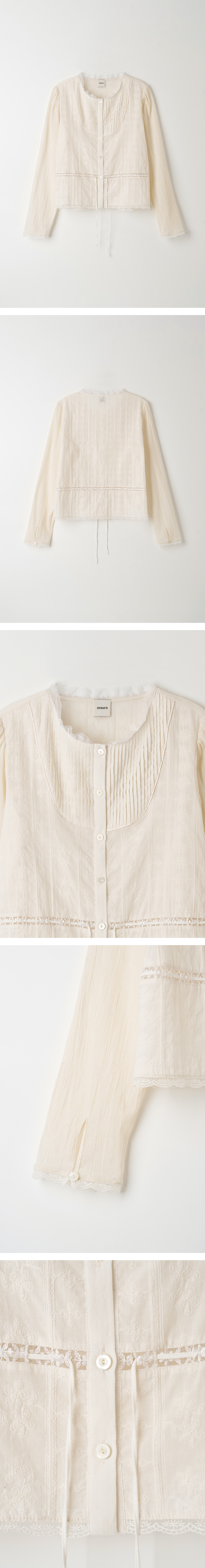 오간자 테이프와 레이스 디테일을 조화롭게 믹스하였고 소매 원단은 요루 원단을 배색으로 사용하여 여리한 느낌을 줍니다.