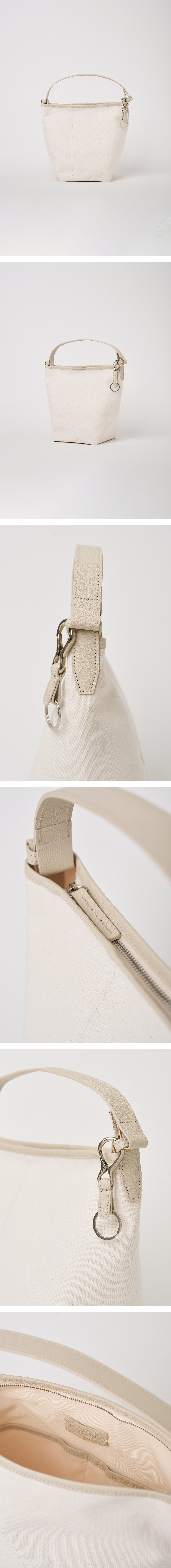 코티드 코튼과 리얼 소가죽 스트랩을 사용한 버킷백입니다.