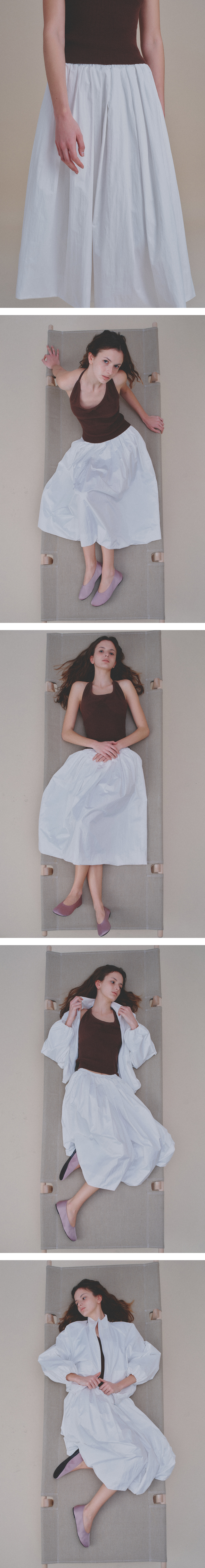 지난 fw 많은 사랑 주셨던 Odette Balloon Skirts를 디벨롭하여 ss시즌에 좀 더 어울리는 매끄러운 광과 터치감이 돋보이는 원단으로 재구성 하였습니다.