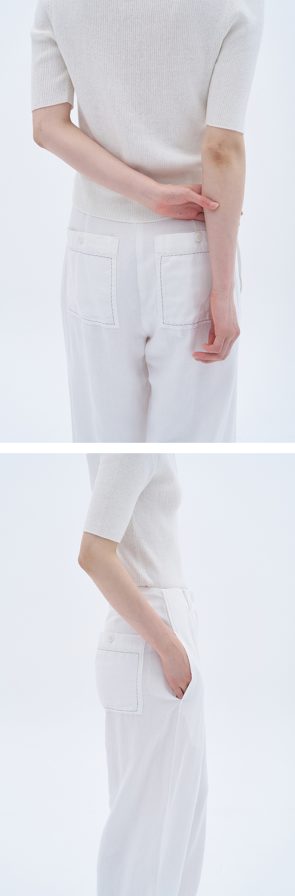 뒷면 포켓에 더해진 은은한 자수 디테일이 포인트 역할을 하며, 화이트 컬러 특유의 비침을 덜어주기 위해 포켓을 추가해 실용성을 높였습니다.