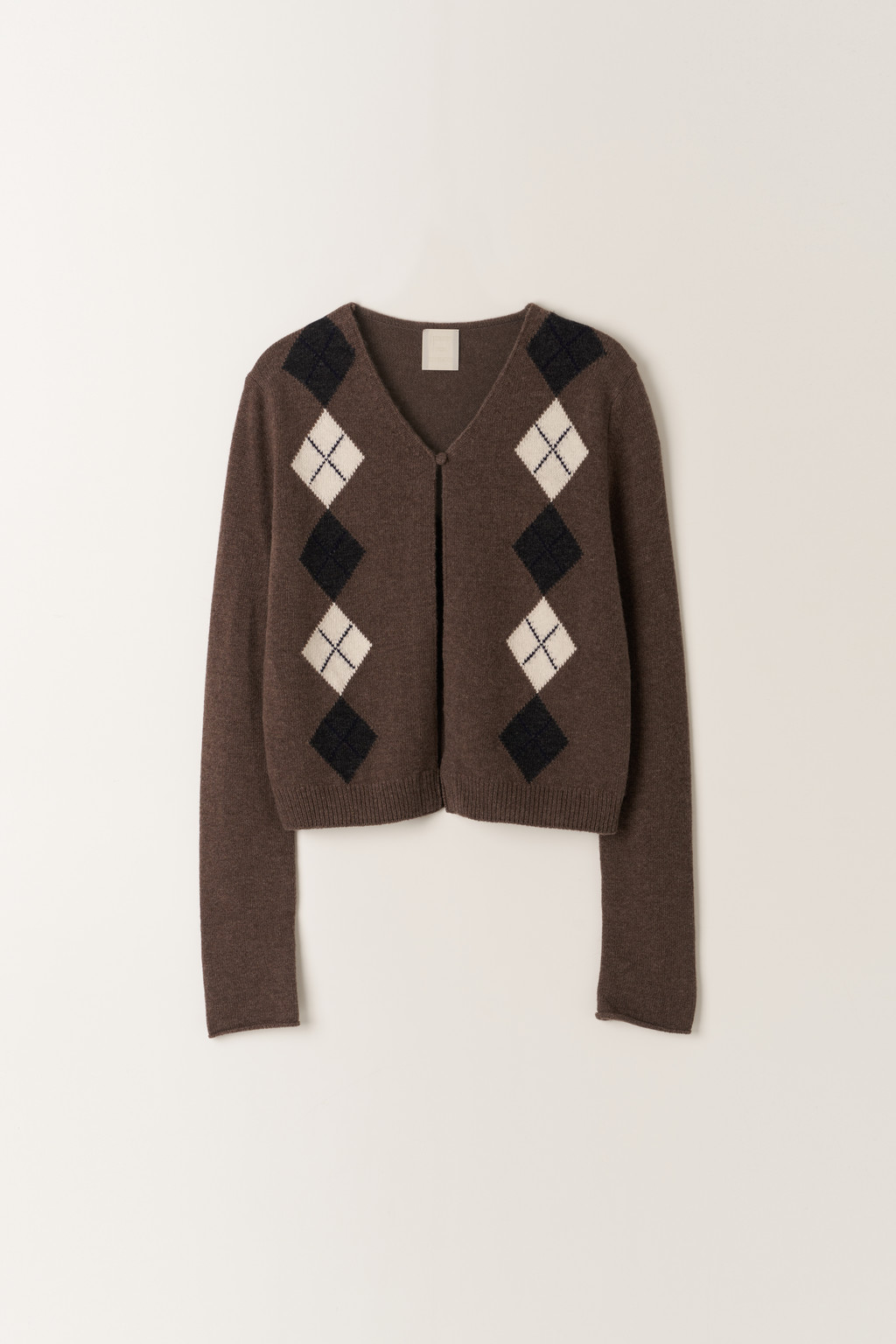 원버튼 형태로 여밈 시 자연스럽게 깊은 V-NECK 라인이 형성되며, 언버튼으로 착용하면 슬림한 볼레로 실루엣이 드러나는 디자인입니다. 가디건처럼 가볍게 걸쳐 스타일링하기 좋은 아이템으로, 아가일 패턴을 전면에 배치해 전통적인 감성을 현대적인 크롭 비율로 재해석했습니다.