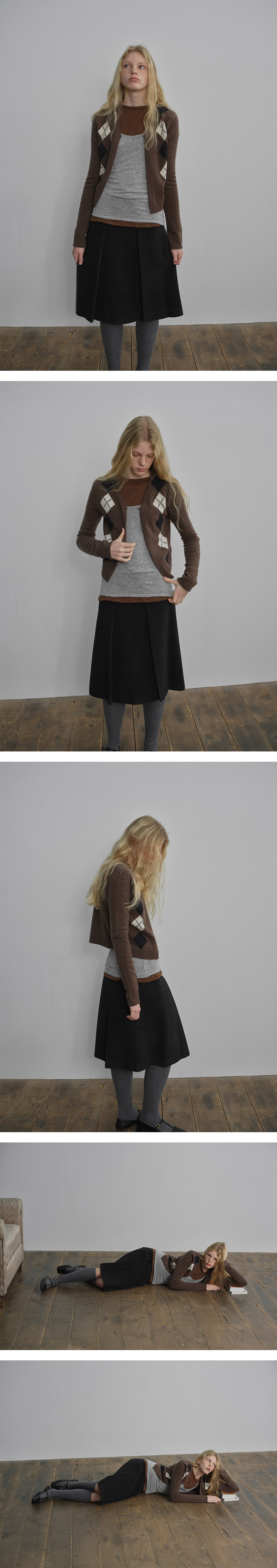 캐시미어 혼방 울 소재로 제작되어 부드러운 터치와 포근한 보온성을 갖추었으며, 신축성 있는 니트 조직으로 편안한 착용감을 제공합니다. 미니멀한 실루엣 안에서 아가일 패턴의 리듬감이 은은한 포인트가 되어 다양한 이너와 자연스럽게 레이어드할 수 있습니다.